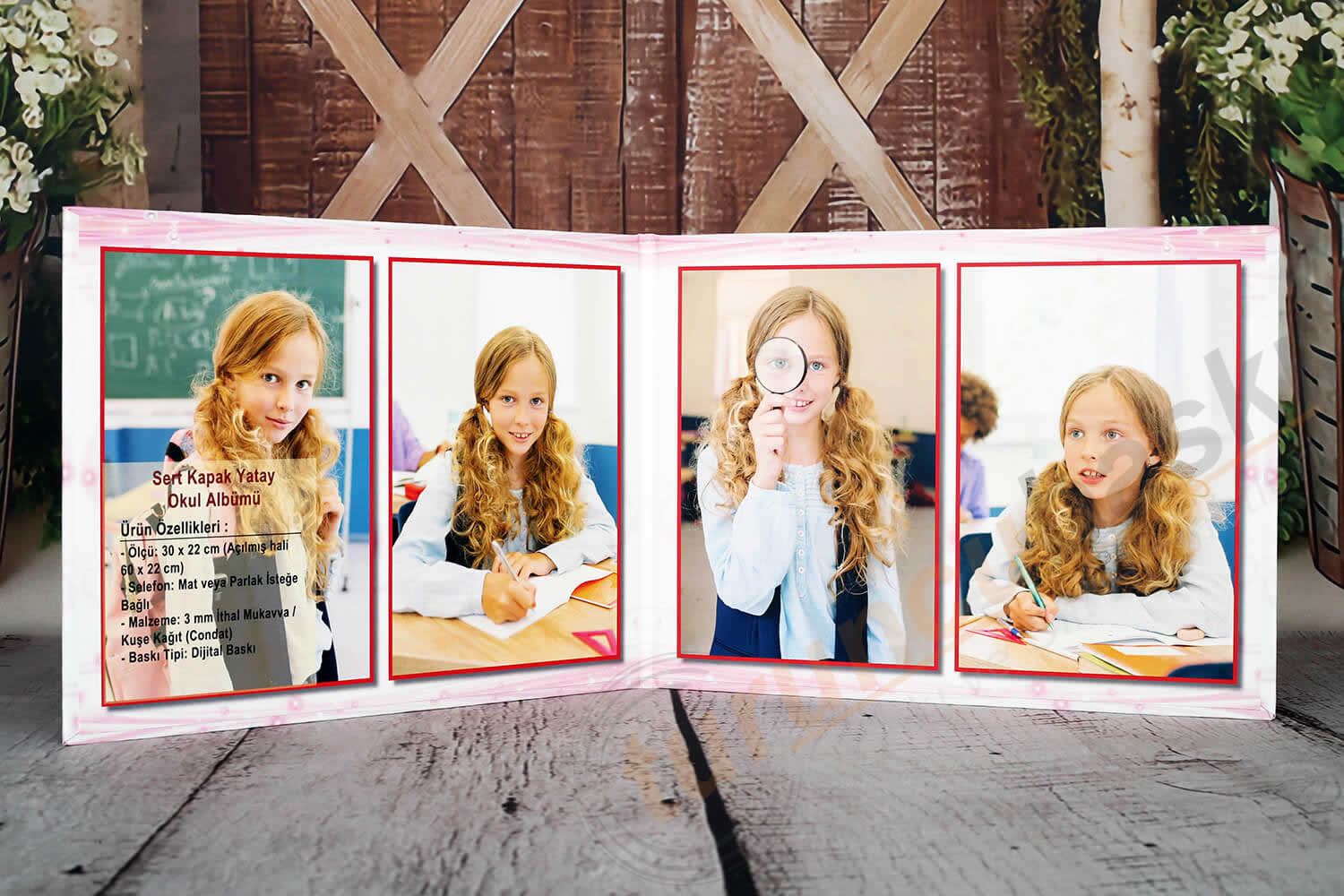 Sert Kapak Yatay Okul Albümü; 30 x 22 cm olarak hazırlanır, albümün açık halinin ölçüleri 60 x 22 cm’dir.
